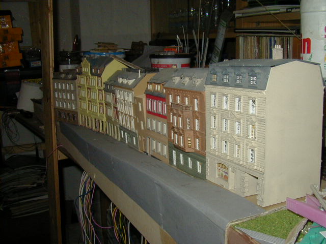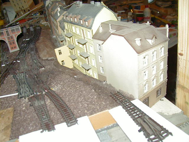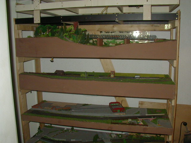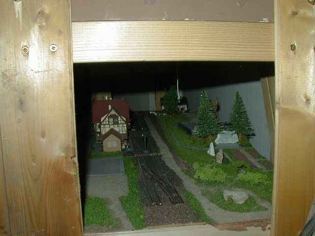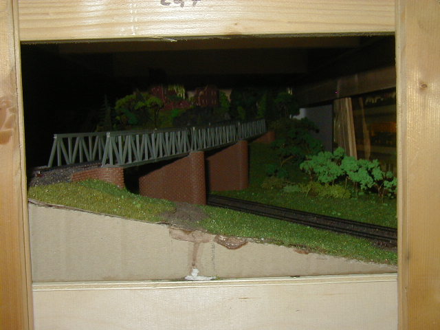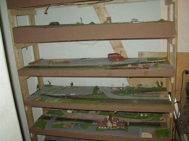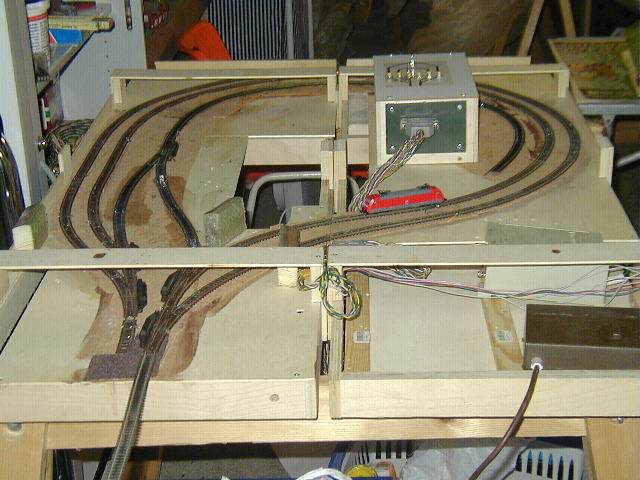 Die beiden Modulrahmen sind so ausgelegt, das Auflagen vorhanden sind, auf die darüber liegende Module/Segmente platziert werden können. Diese Stützen sind mit Scharnieren in der mitte zwischen beiden Segmenten versehen, so das die Wendeschleifenhälften zusammen geklappt werden können. Die Wendeschleife ist zweigleisig ausgelegt, so das hier ein Zug "geparkt" werden kann. Ausserdem ist ein Wendezuggleis vorhanden, so das ein gezogener Wendezug entweder über die Wendeschleife wieder gezogen auf die Reise gehen kann, oder ebend über dieses Wendezuggleis dann zurück geschoben wird. (bzw. umgekehrt) Hier noch ein Bild der abgedeckten Wendeschleife. Den bau der Abdeckung beschreibe ich stellvertretend für andere Module/Segmente hier . |